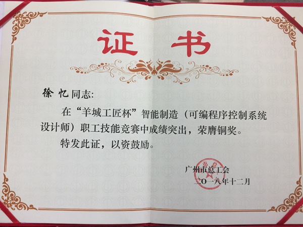 為提升我司技術(shù)人員實(shí)踐操作能力,我司員工積極參加18年12月15-16日由廣州市總工會舉辦的首屆“羊城工匠杯”智能制造(可編程序控制系統(tǒng)設(shè)計(jì)師)職工技能競賽。分別榮獲金銀銅,優(yōu)秀組織獎四個獎項(xiàng)。